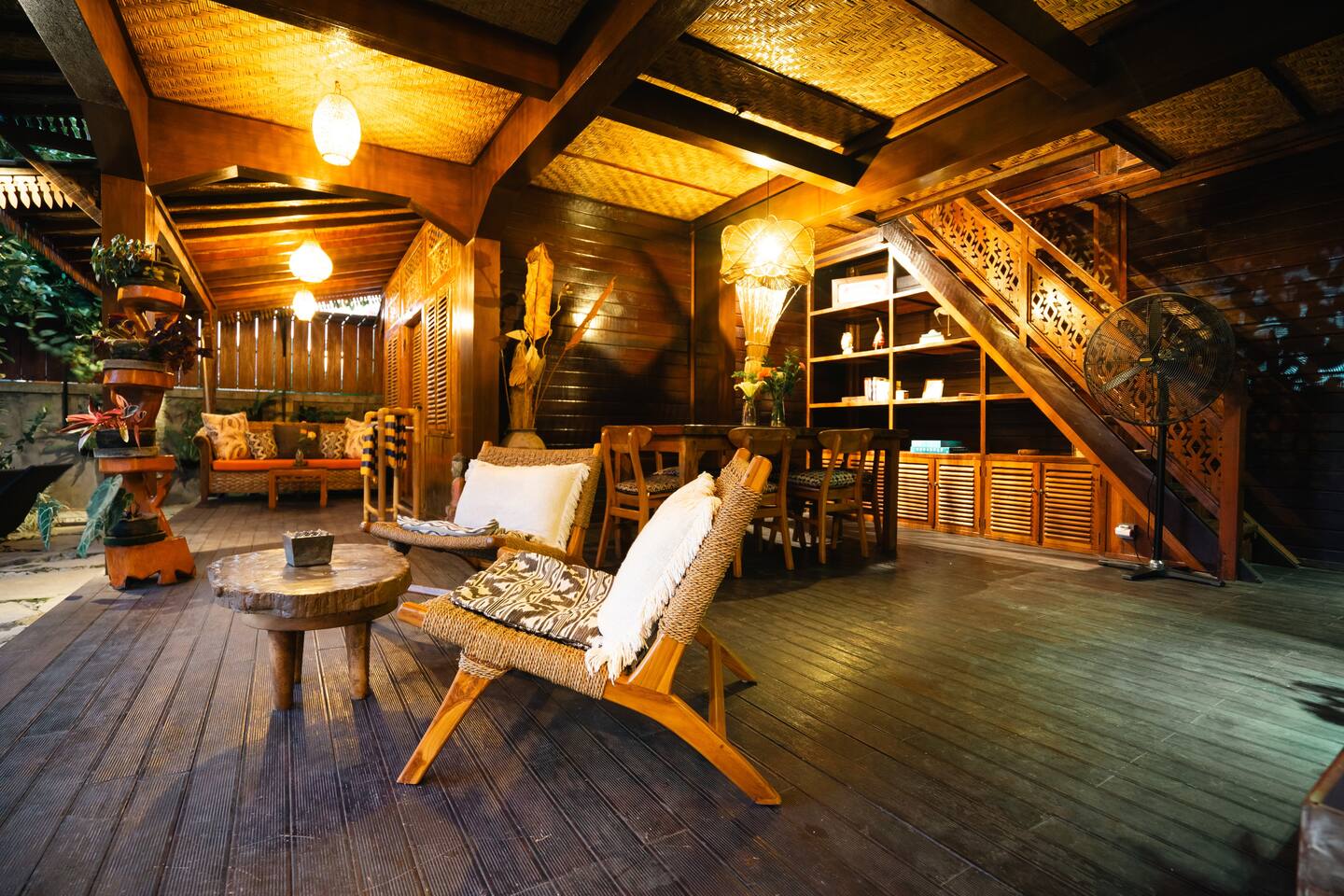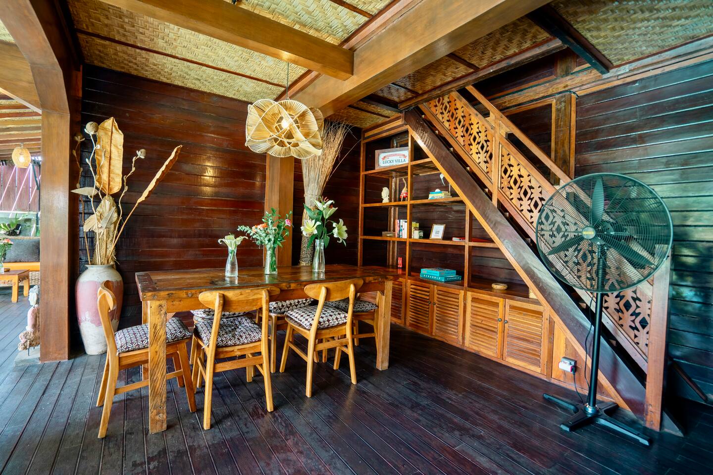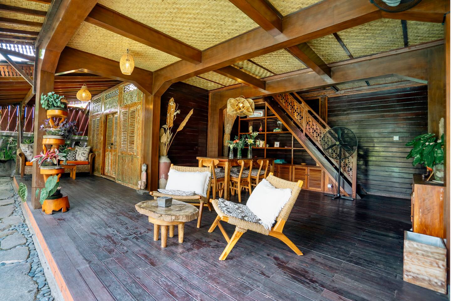 Rumah Elfi, open for guests since mid-July 2024, consists of a two-storey main house with 3 bedrooms, each with air conditioning and ceiling fan and featuring en-suite bathrooms. Two of the bedrooms are located on the ground floor, separated by the open-plan living room with a dining table and cozy chairs. There are additional comfortable seating areas in front of both bedrooms.