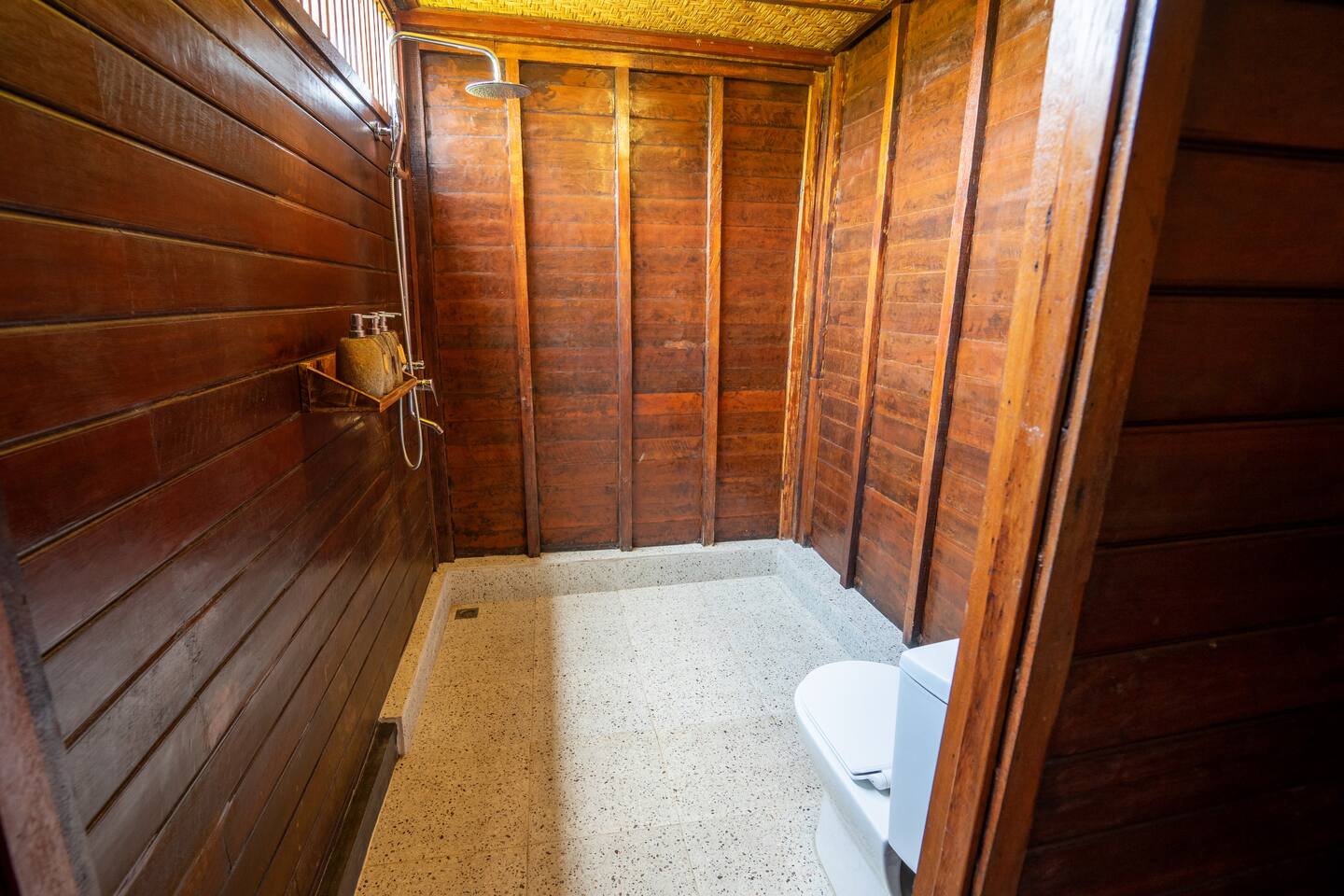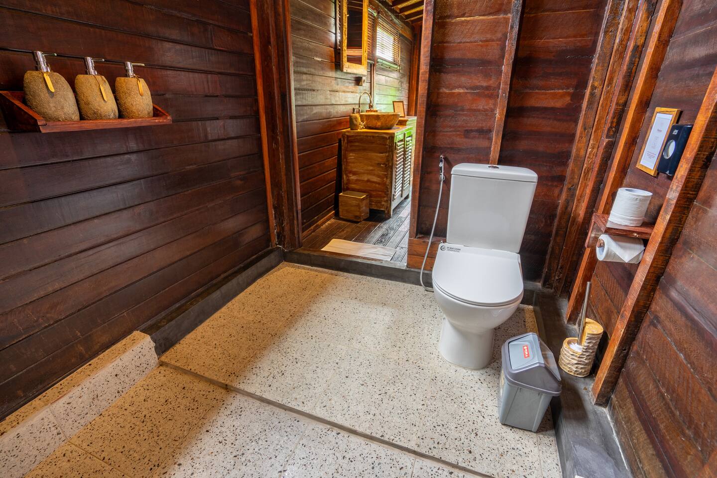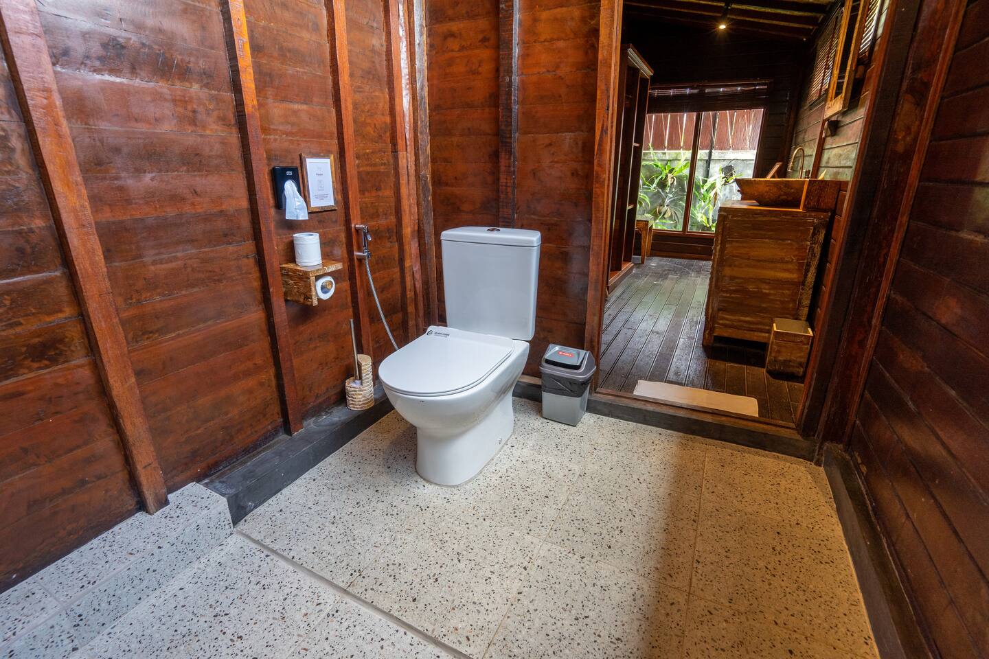 Rumah Elfi, open for guests since mid-July 2024, consists of a two-storey main house with 3 bedrooms, each with air conditioning and ceiling fan and featuring en-suite bathrooms. Two of the bedrooms are located on the ground floor, separated by the open-plan living room with a dining table and cozy chairs. There are additional comfortable seating areas in front of both bedrooms.