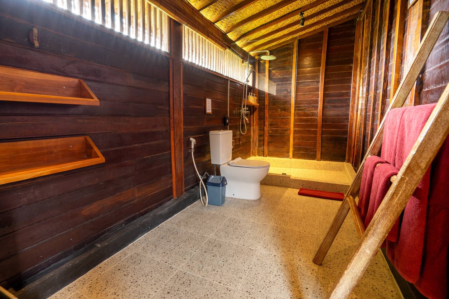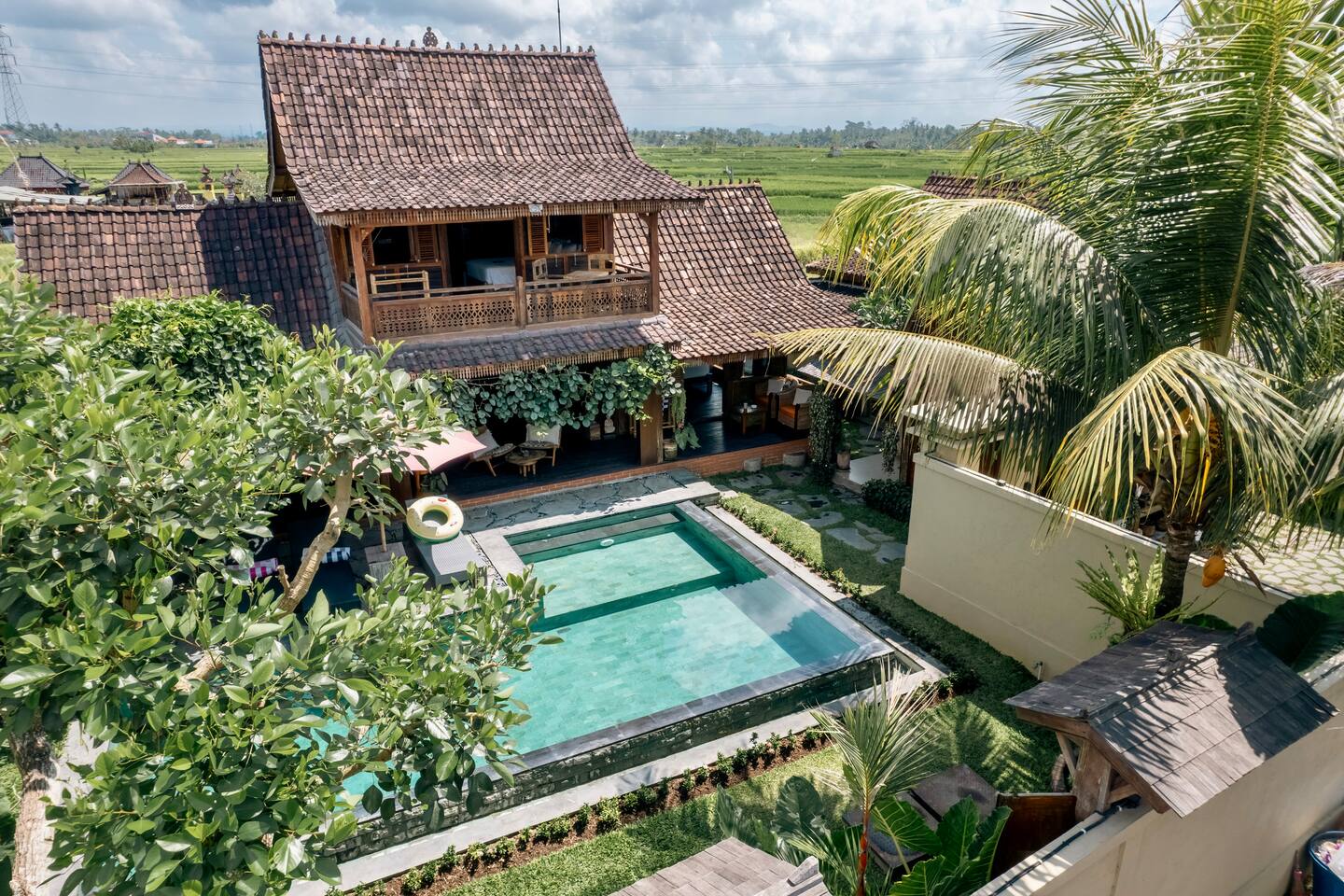 The master bedroom, with its own large veranda, is situated on the second floor. You will enjoy your time on this veranda and be able to see both the sunrise and the sunset. The large L-shaped swimming pool is located in the beautifully landscaped spacious garden, with a pool deck featuring sun loungers. The pool measures 8x3 meters, with an additional 2x3 meter area for comfortable splashing or sitting, making it a true gem at Rumah Elfi. A separate small house at the end of the garden houses the kitchen, equipped with all amenities including an oven. While making yourself a coffee or preparing a tasty meal, you can enjoy views of the pool and beautiful garden through two large windows that can be fully opened. We provide a small welcome pack of coffee, tea, sugar, and creamer to help you until your first purchase at the supermarket. For those eager to explore the local area, Rumah Elfi is ideally located. The surrounding village of Lodtunduh is renowned for its artistic heritage and tranquil atmosphere, offering visitors a glimpse into traditional Balinese life. Guests can visit nearby art galleries and workshops, participate in cultural ceremonies, or simply enjoy a leisurely stroll through the rice paddies and rural landscapes. Situated alongside the rice fields, it also offers an ideal setting for a leisurely morning walk where you can engage with locals and rice farmers while enjoying picturesque volcano views. Rumah Elfi in Lodtunduh is a captivating and inviting guesthouse nestled in a village of Lodtunduh, just a short scooter drive from the vibrant cultural hub of Ubud. This 3-bedroom Joglo blends traditional Balinese charm with modern comforts, creating an idyllic haven for travelers seeking relaxation and cultural immersion. It will be a very special experience for you to live in a wooden house - and when you sit on the veranda in the morning, you can truly indulge in the serenity of Bali. Just a short drive away, the bustling town of Ubud awaits with its array of attractions, including the Ubud Monkey Forest, Ubud Palace, and vibrant Ubud Market, just to name a few. The area is also known for its wellness offerings, with numerous yoga studios, spas, and holistic centers available for relaxation and rejuvenation. Rumah Elfi is centrally located for all kinds of excursions - Ubud is only about 10 to 15 minutes away by scooter, the east coast (e.g. Sanur) about half an hour, and the west coast (e.g. Seminyak) about 45 minutes, depending on Bali traffic, of course. We recommend renting a scooter – but if that’s not your preference, you can easily rely on services like Gojek or Grab, which not only offer convenient transport but also deliver a wide range of meals right to your door. We’re more than happy to assist you with scooter rental and have it delivered tom Rumah Richard, complete with helmets and a smartphone holder.